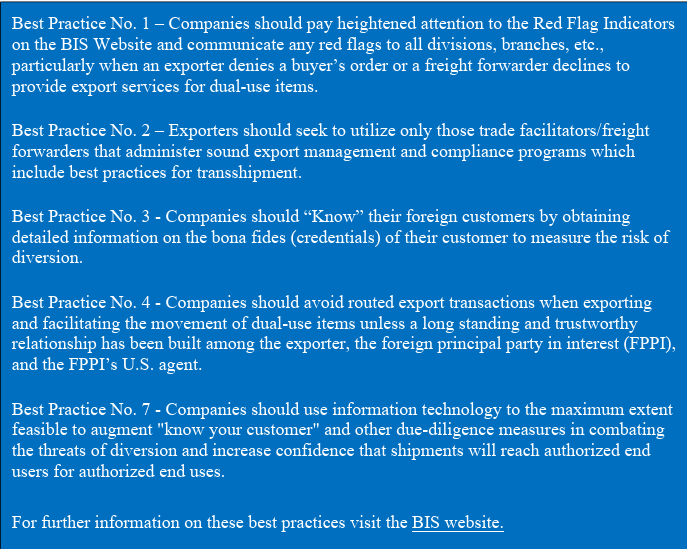 CTPAT exporters should also be aware of diversion risks through transshipment trade. The Bureau of Industry and Security (BIS) of the U.S. Department of Commerce published seven best practices that guard against this type of risk. Some of these best practices include: